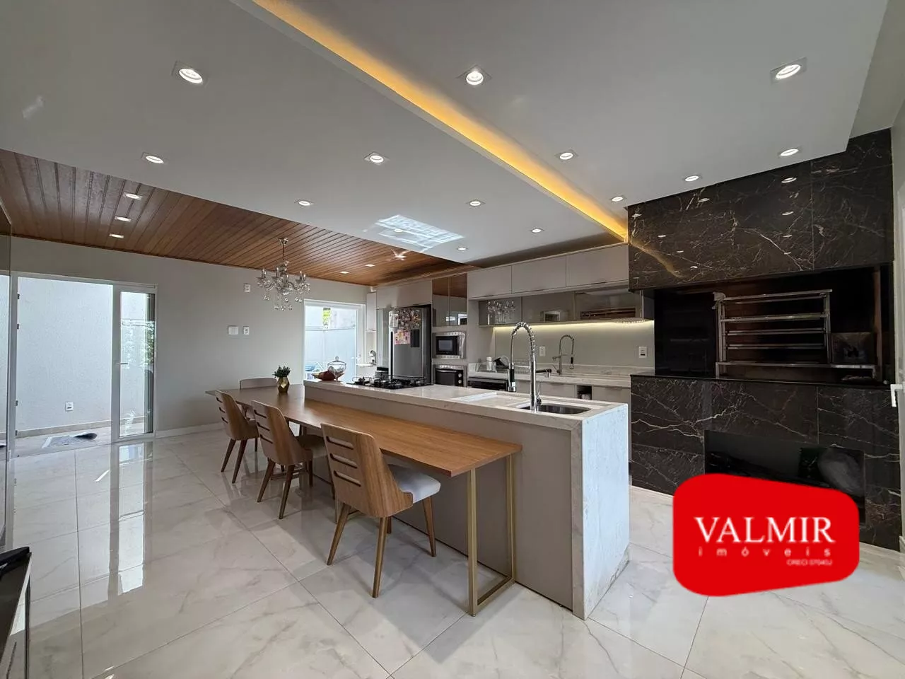 A área social foi pensada para integrar os ambientes e valorizar os momentos em família. A cozinha, totalmente equipada e integrada, conta com churrasqueira e parrilha, perfeita para receber amigos. A sala de estar com lareira convida ao aconchego, enquanto o escritório mobiliado oferece o espaço ideal para trabalho ou estudos em casa. A casa dispõe ainda de lavabo, banheiro de apoio à piscina e lavanderia com móveis sob medida, que aliam praticidade e elegância.